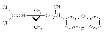 【化學名稱】:(RS)-a-氰基-4-氟-3-苯氧基芐基(1RS,3RS;1RS,3SR)-3-(2,2-二氯乙烯基)-2,2-二甲基環(huán)丙烷羧酸酯